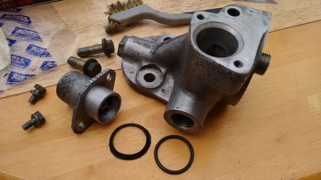 As seen above, the O-ring (left) that goes around the thermostat housing was in a poor state so this probably leaked a bit too. New one is ERC5913 (right).