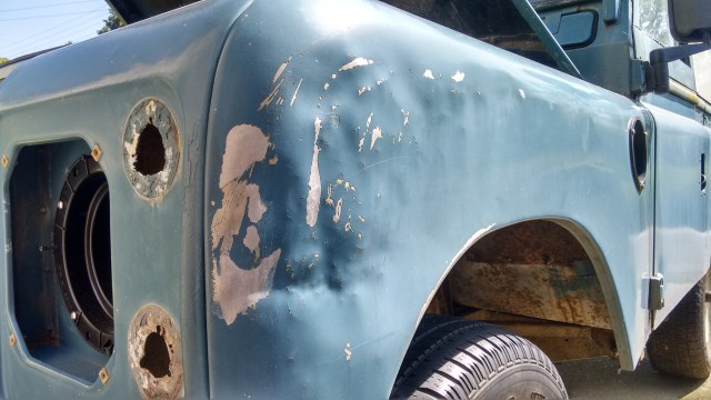 Incidentally, whilst looking at the front left, the outer wing has at some stage sustained some damage. I’m wondering whether to just paint it and leave the dents as ‘character’, or maybe try one of the replacement ABS wings. Would appreciate any thoughts below, especially from someone who has used an ABS panel. The rear of the vehicle this side also has a substantial crease, but thankfully that hasn’t suffered ‘panel-beating’ by Father Ted as in the case of the front. I’m sure that I could greatly improve this by beating but the outer wing section would have to be removed, not a five minute job.
