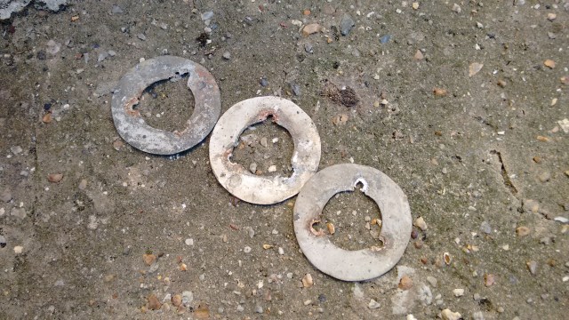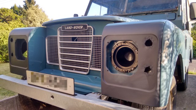 As has been mentioned before, the Birmabright is corroded where the sidelights and indicators were fixed. This is hastened I think by the practice of using chassis-earth from the fixing screw to supply the lights. My replacement wiring will address this, albeit after the horse has bolted. I’m not sure if the strengthening rings below were ever an official Land Rover part, I cannot find them mentioned anywhere. I toyed with the idea of having a laser-cut company make me 200 or so, and selling the other 192 on eBay to cover my costs, but I lack the entrepreneurial ambition, and time. So I mounted them by screwing in from the back with slightly oversized stainless self-tappers biting into the fixing holes so they are nipped into place quite firmly.