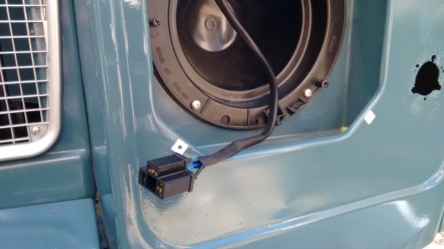 As further protection, where possible, wiring is further protected at exit points with PVC sleeving. Here I have terminated the 3-way plug. On each side, the wiring from headlights is completed in one continuous run to the dash, with no connectors or crimps in-between.