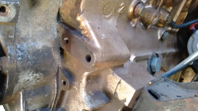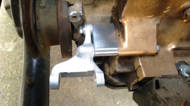 I will detail these for the benefit of others as it took me 2 goes to get it right. We are fitting a 1950’s bracket to a 1980’s engine, with a hefty lump between. There is quite a strain on this assembly so we want maximum thread penetration. The 2 bolts that screw into the block, allowing for one flat and one spring washer, are M8, 70mm long. The bolt that goes through the lug on the block, into the bracket is 5/8 UNF, 124mm long for which I removed 3mm from a 5″ bolt. I found that a 4 1/2″ bolt wasn’t quite long enough.