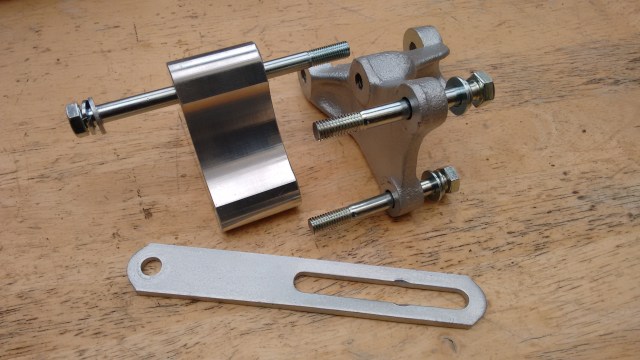 The cleaned and painted bracket and adjuster, alloy spacer and bolts cut to size: