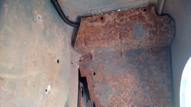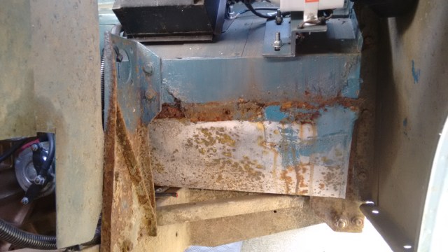 Determined to make up for the lack of progress the previous evening I fitted the mudshield that I had painted at the weekend. It is basically a mirror image repeat of the offside that I completed in August. So, I made up a strengthening bracket to go under the wing-top, snipped and riveted a repair plate to the mounting on the inner wing and bolted it in. Also at the weekend I had wire-brushed, rubbed down, Fertan-treated and painted the footwell. Like the other side, the footwell has had a piece of flat steel welded on, in a serviceable, if not pretty manner and hopefully it will last a couple of years. It is double-thickness in places, sort of plates on plates, reasonably solid for now, but it will need to be addressed at some point.