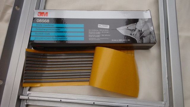 Fortunately I did a dry run with the tape, only to find that it wasn’t thick enough with the existing frame screw holes for the aluminium beading. So, I tried to source an alternative to the ‘Dum Dum putty’ that was originally used but no longer manufactured. The word putty is rather misleading here, it is more like a firm, sticky Plasticine that never hardens, even after 40 years.